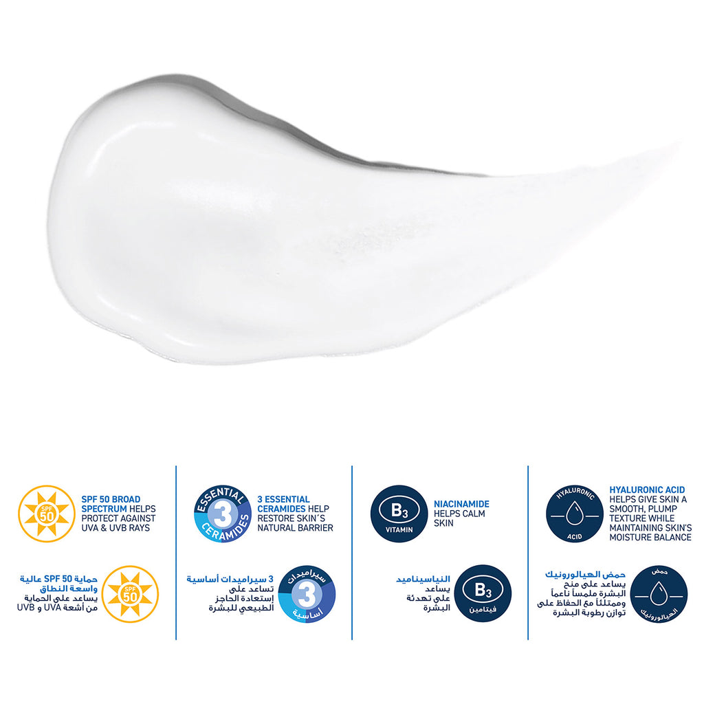 This daytime multitasker features broad-spectrum SPF 50 sunscreen and beneficial ingredients like our three essential ceramides, hyaluronic acid, and niacinamide. It also includes MVE Delivery Technology, which releases a steady stream of moisturizing ingredients for continuous, all-day hydration.