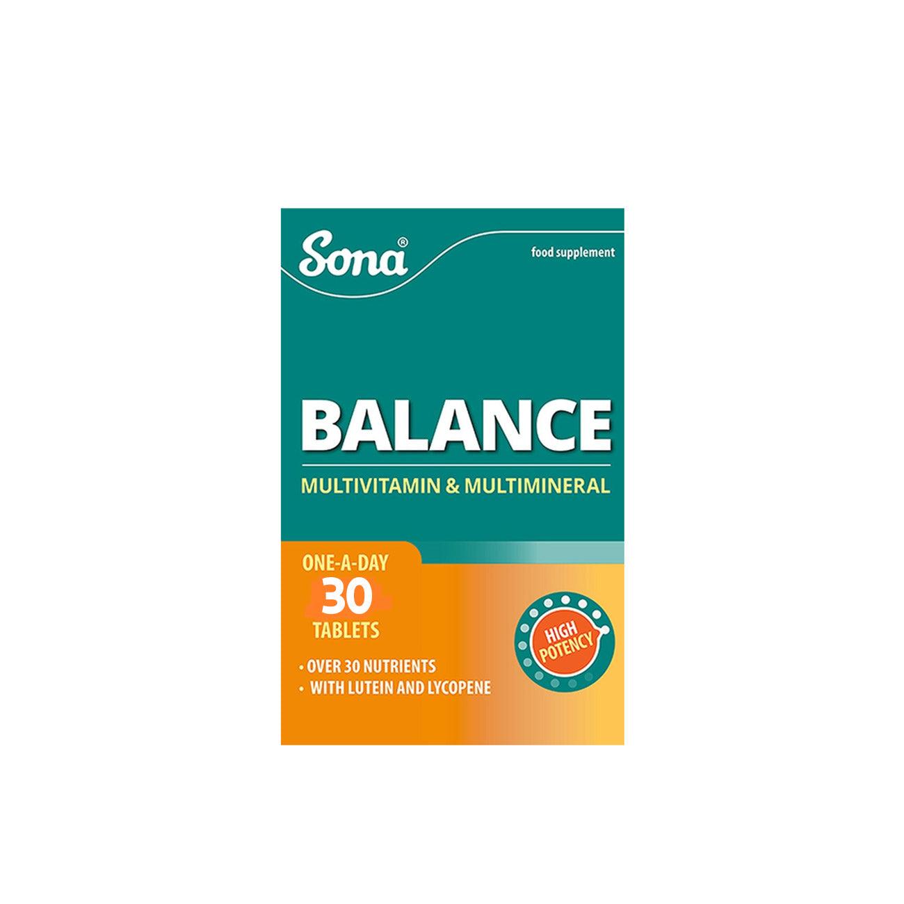Sona Balance Multivitamin & Multimineral - Vitamins and minerals, in addition to various other nutrients, in the right amounts, play important roles in developing and maintaining your body in optimal health. For various reasons, individuals do not always obtain the right amount or variety of nutrients from their diet alone. Taking a multivitamin/multimineral can help ensure that your body's nutritional requirements are met. Sona Balance tablets provide a comprehensive supply of over 30 essential vitamins, minerals and antioxidants which contribute to normal energy metabolism, mental performance, the reduction of tiredness and fatigue, normal function of the immune and nervous systems as well as many other important functions.