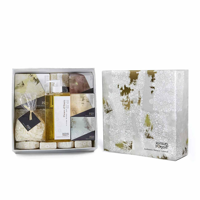 We use a blend of precious essential oils, fine fragrance and moisturizing Olive oil, Vitamin E, Shea butter and Glycerin for beautiful, dewy skin and a relaxed spirit.
