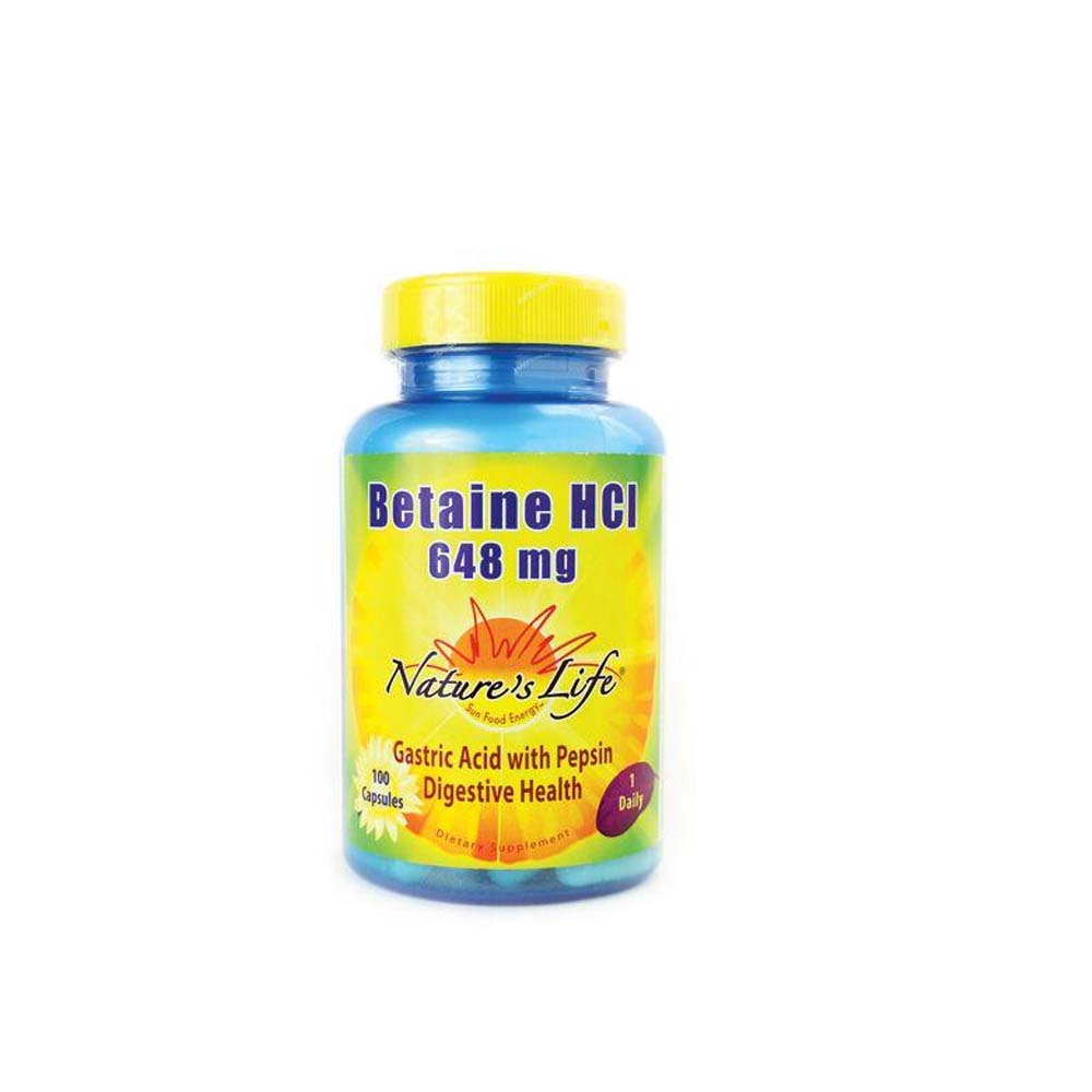 Nature's Life Betaine HCl is a natural aid to support healthy digestive function. This formula delivers 648 mg of Betaine HCl as well as 130 mg of pepsin per serving.