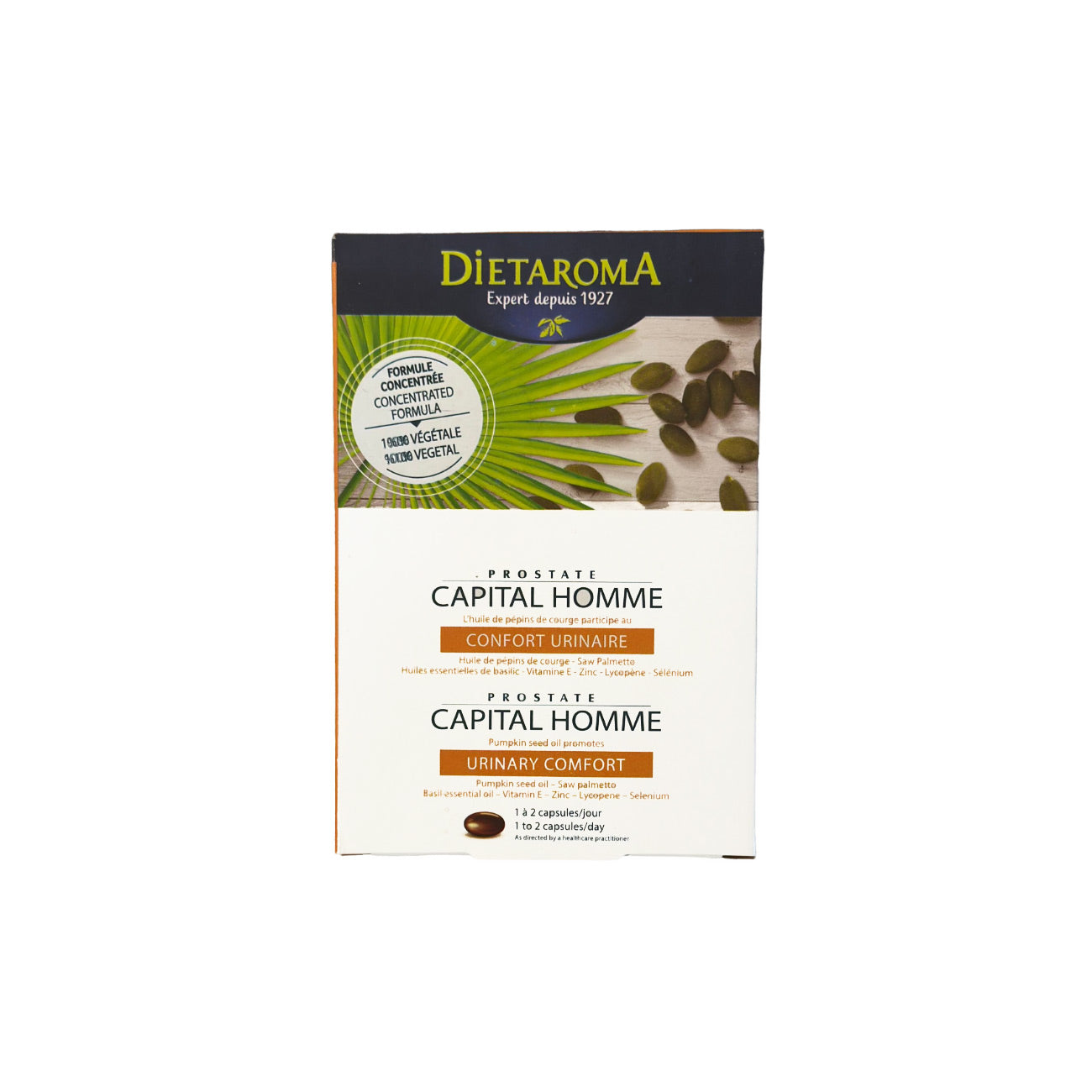 For the well-being of men after 50... Have the Dietaroma reflex with the food supplement with pumpkin seed oil Complexe Capital Homme Prostate.