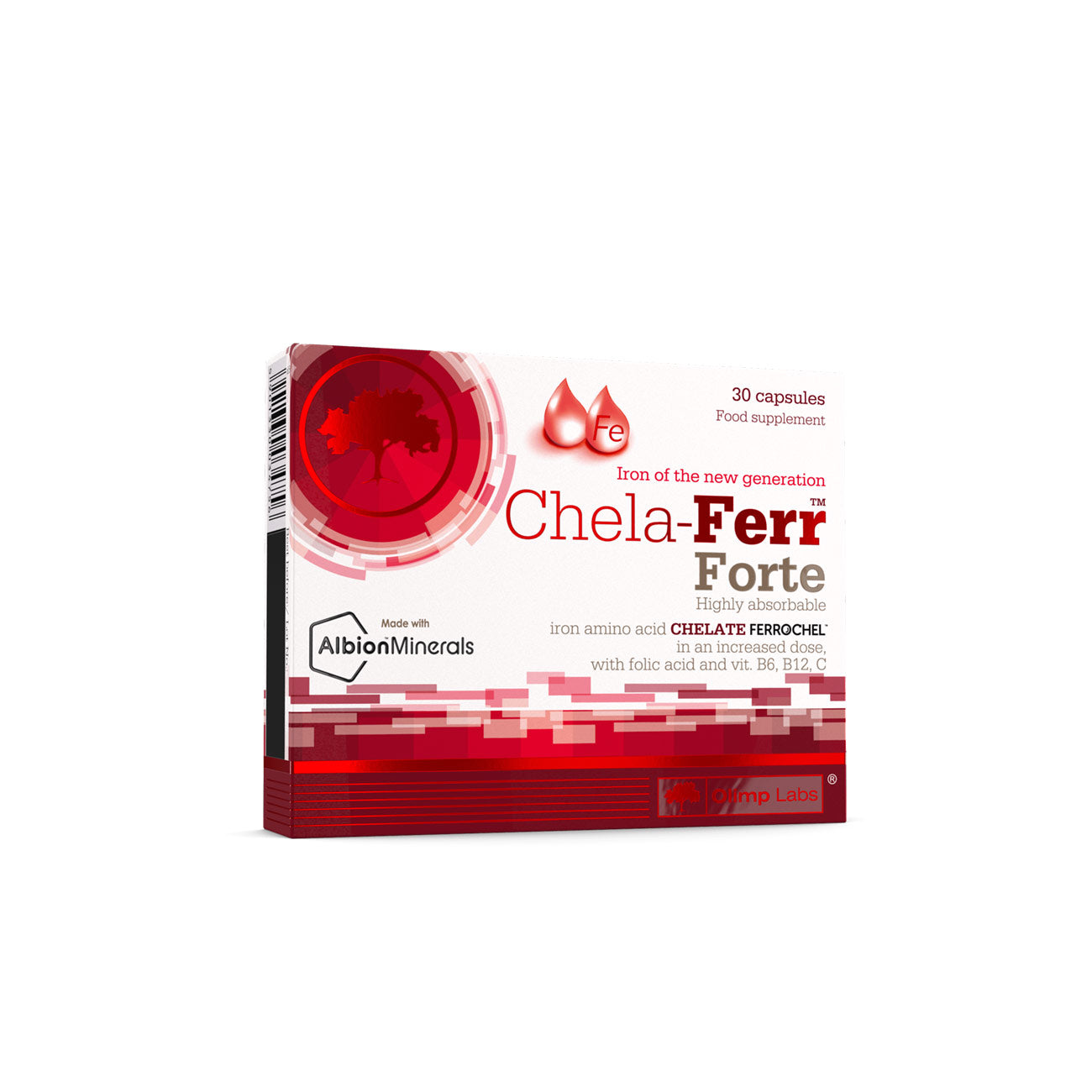 Chela-Ferr Forte is a food supplement containing Ferrochel iron (in the form of amino acid chelate) – highly absorbable form of iron in increased dose enriched with folic acid, and vitamins: B6, B12, C.