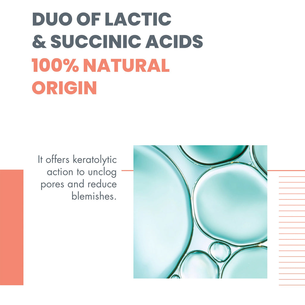 The exclusive acid duo of lactic and succinic acids helps to exfoliate the skin, reducing the appearance of blemishes, pores and marks.