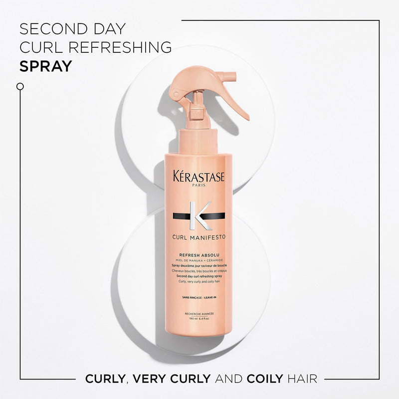 Second day curl refreshing spray infused with Manuka honey and Ceramide for curly, very curly and coily hair. Lightweight mist instantly rehydrates, revitalizes and reactivates curl definition and softness between washes. Promotes natural pattern formation, enhances bounce and volume while reducing frizz and enhancing shine.