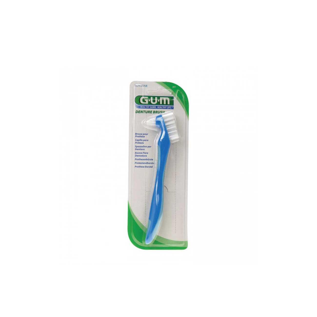 The GUM® Denture brush is recommended by dental professionals for the daily care of removable dentures and acrylic retainers. The GUM® Denture brush consists of two differently configured brush heads: a flat bristled head for smooth surfaces and a single-tufted head for hard-to-reach areas. The strong flat bristles are extremely resilient and efficiently remove dental plaque, food particles and other debris from the inner and outer surfaces. The single-tufted head consists of tapered bristles, which provide superior cleaning in the hard-to-reach areas regular toothbrushes cannot reach.