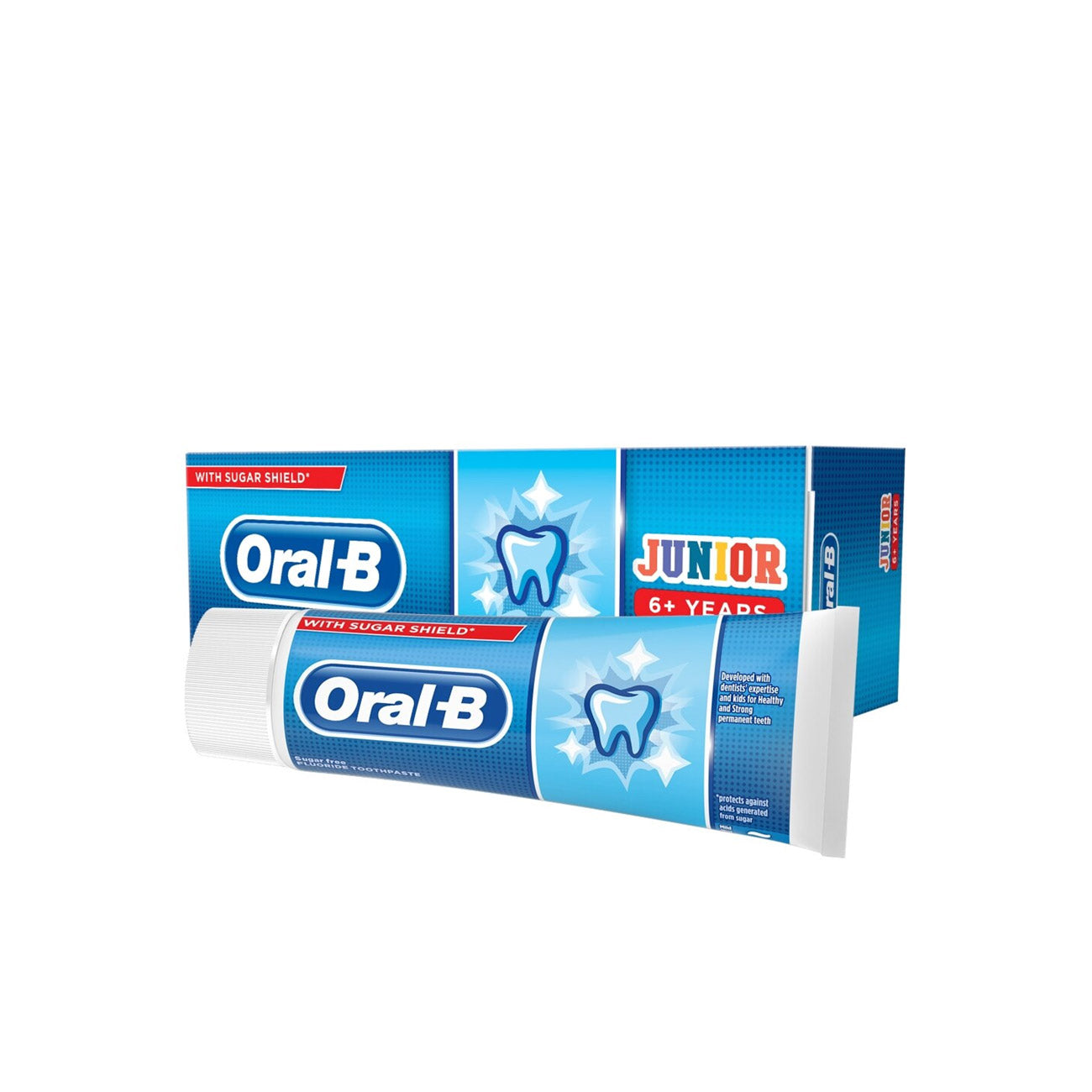 Oral-B Starwars Junior Toothpaste with sugar shield* protects your child's teeth against acids from sugars in everyday food. *protects against acids generated from sugar. Sugar free fluoride toothpaste.