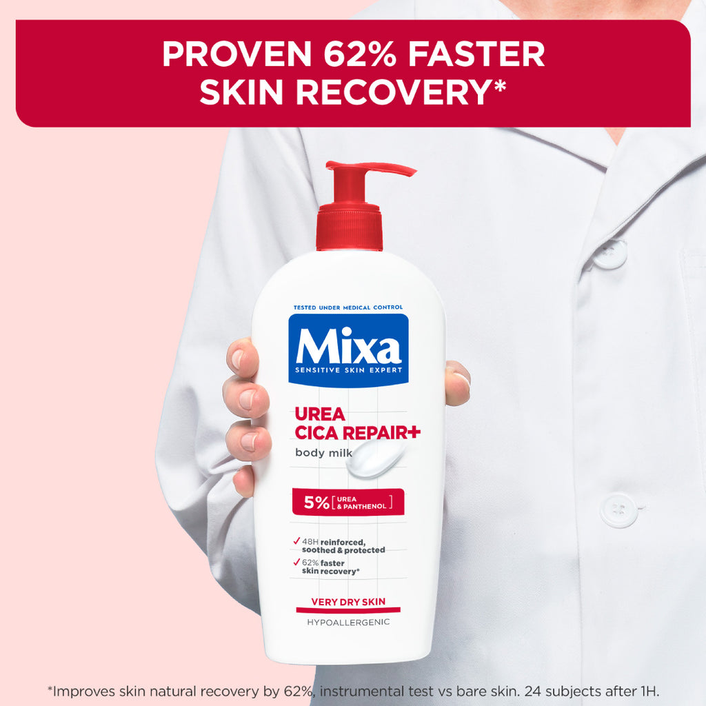 Mixa Urea Cica Repair+ Body Lotion is designed for dry and rough skin, including skin prone to keratosis pilaris, a common condition that appears as small rough bumps or “chicken skin,” often with redness or uneven texture. It helps smooth, hydrate and renew the skin while providing instant comfort and lasting relief. The hypoallergenic formula is non-greasy, non-sticky and absorbs quickly, making it suitable for sensitive skin and daily use. Enriched with 5% urea to smooth and reduce roughness, and panthenol to soothe the skin, it helps visibly improve skin texture and supports faster skin recovery, leaving skin feeling softer, smoother and protected for up to 48 hours.