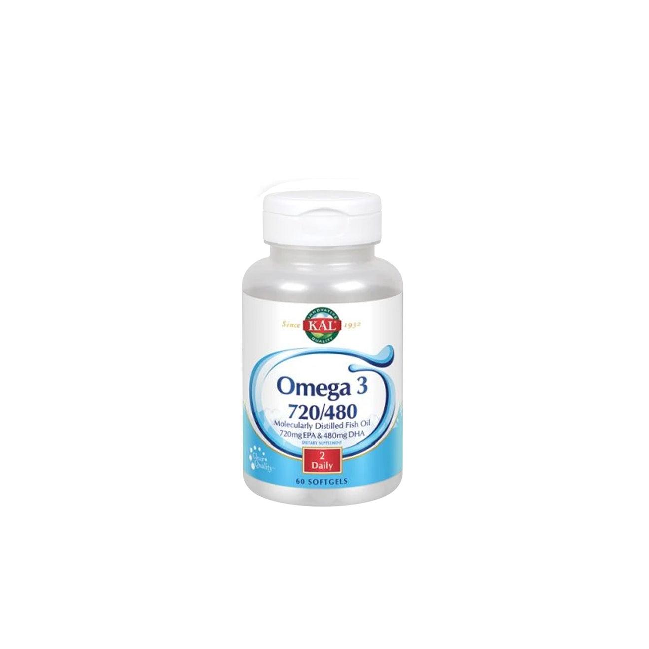 KAL® Omega 3 720/480 Fish Oil comes from fish caught in cold water. Two softgels provide high levels of EPA and DHA which have been studied for their ability to provide nutritive support for many health benefits. KAL® fish oils go through a purity process, including molecular distillation, to remove heavy metals, PCBs, dioxins, furans and other contaminants to meet superior fish oil standards.