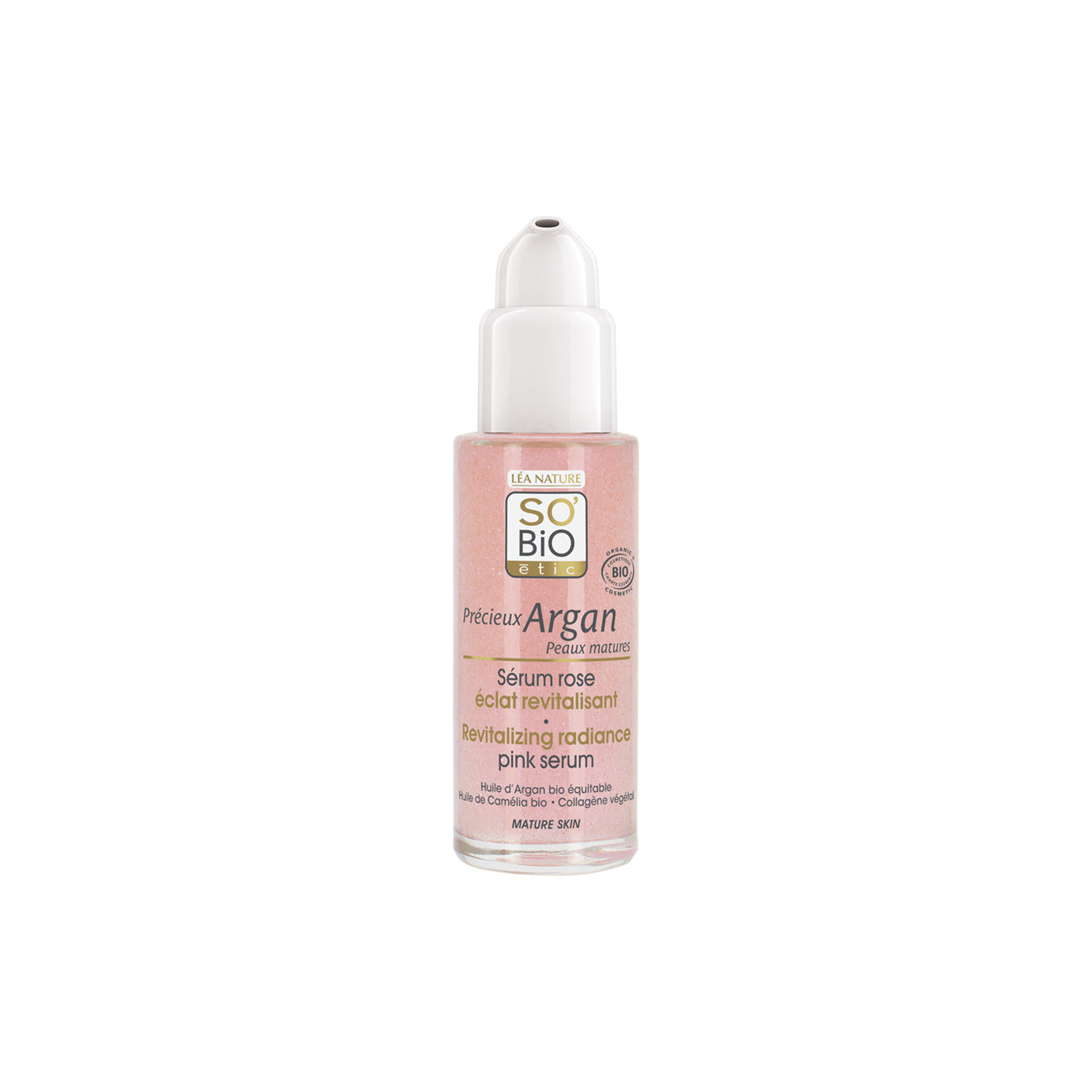 This pearly pink serum enriched with nourishing organic argan oil micro-beads, restructuring organic camellia oil and densifying plant collagen, restores comfort, firmness, and vitality to mature skin.
