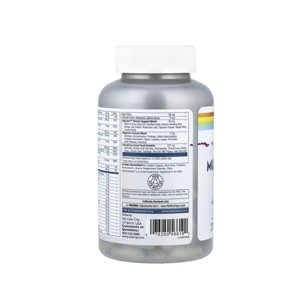 Vitamin A (Natural Beta Carotene, Retinyl Palmitate) 5000 IU Vitamin C (Ascorbic Acid, Ascorbyl Palmitate) 500 mg Vitamin D (Cholecalciferol) (D3) 800 IU Vitamin E (Natural-Source d-Alpha Tocopheryl Succinate) 200 IU Thiamine (Mononitrate) (B1) 50 mg Riboflavin (Riboflavin-5-Phosphate) (B2) 50 mg Niacin (Niacinamide) (B3) 50 mg Vitamin B6 (Pyridoxine HCl, Pyridoxal-5-Phosphate) 50 mg Folate (Folic Acid) 800 mcg Vitamin B12 (Cyanocobalamin, Methylcobalamin) 100 mcg Biotin 500 mcg Pantothenic Acid (Calcium Panothenate) 50 mg Calcium (Carbonate, Calcium Amino Acid Chelate Complex) 400 mg Iron (Iron Amino Acid Chelate Complex, Ferrous Fumarate) 18 mg Iodine (Kelp) 1000 mcg Magnesium (Oxide, Magnesium Amino Acid Chelate Complex) 200 mg Zinc (Zinc Citrate, Zinc Amino Acid Chelate Complex) 15 mg Selenium (Selenomethionine) 200 mcg Copper (Copper Amino Acid Chelate Complex) 1.5 mg Manganese (Manganese Amino Acid Chelate Complex) 5 mg Chromium (GTF Chromium Polynicotinate) (ChromeMate®) 150 mcg Molybdenum (Glycinate) 1.9 mcg Potassium (Chloride) 99 mg Boron (Boric Acid) 1.5 mg Trace Mineral Concentrate 1 mg Lutein (Marigold flower extract) 3 mg Lycopene (from Tomato) 3 mg Coenzyme Q10 2 mg Acetyl L-Carnitine 25 mg Alpha-Lipoic Acid 25 mg Hyaluronic Acid 5 mg Choline Bitartrate 25 mg Inositol 50 mg PABA (Para-Aminobenzoic Acid) 25 mg Lecithin (soy) 30 mg Bioflavonoids Concentrate 100 mg Rutin Concentrate 50 mg Hesperidin Concentrate 50 mg Quercetin 30 mg Pectin 20 mg Papain (2,000 Pu/g) 20 mg Betaine HCl 5 mg Phytase (Supplying 2,000 Pu/g) 2.5 mg Royal Jelly 3.5X (Equivalent to 10.5 mg) 3 mg Bee Pollen 50 mg Acerola Cherry (Malpighia glabra) (berry) 5 mg - Spectro™ Woman Support Blend: (Black Currant Seed Oil, Eleuthero Root, Korean Ginseng Root, Ginkgo Leaf Extract, Rosemary Leaf, Cayenne pepper, Ginger Root, Licorice Root) 90 mg - Digestive Enzyme Blend: (Amylase, Glucoamylase, Protease, Alpha Galactosidase, Cellulase, Bromelain, Papain, Lactase, Lipase, Pectinase [with Phytase], Invertase) 5 mg - Energizing Green Food Complex: (Spirulina, Broken Cell Chlorella, Chlorophyllin, Barley Grass, Wheat Grass, Chicory Root, Cabbage, Broccoli, Bell Pepper, Aloe Vera Gel) 227 mg Other Ingredients: Gelatin capsule, maltodextrin, cellulose, gelatin, acacia, sucrose, magnesium stearate, silica and sodium caseinate (milk).