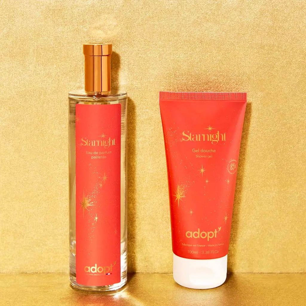 Be radiant day and night with the Starnight set: the cosmic duo to shine all year round. Inside, a glittery eau de parfum and matching shower gel. Their accords of pear, flower, vanilla and whipped cream envelop you in their wonderful aura. Feminine, surprising, optimistic, a magical combo that reveals the best version of yourself! Tested under dermatological control. Formula adapted to vegans.