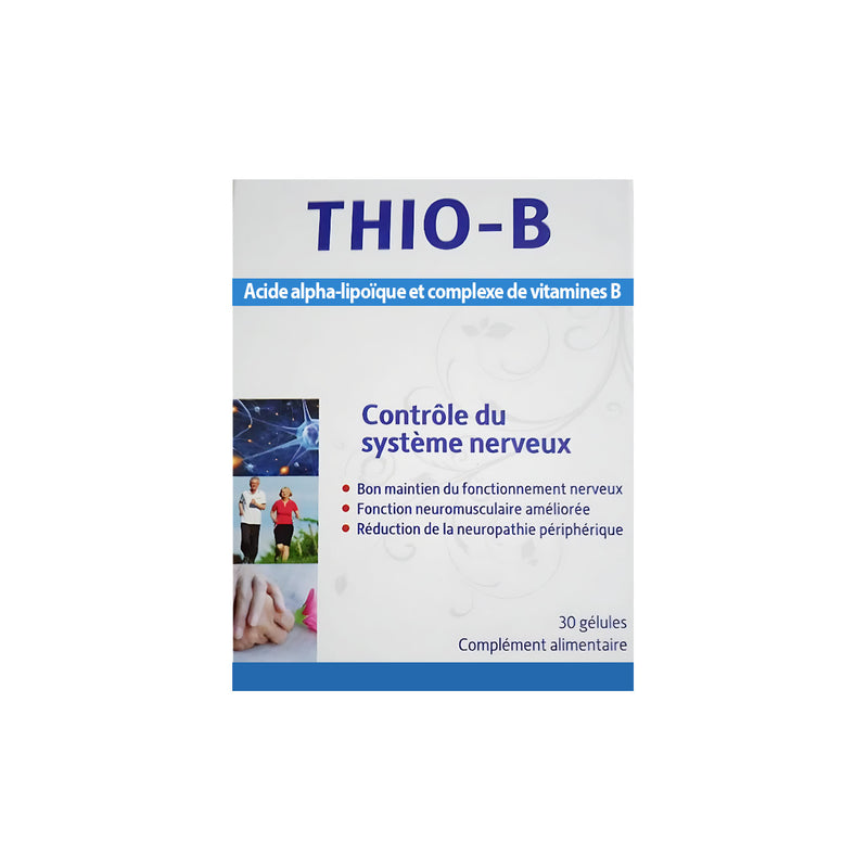 Thio B is a dietary supplement whose role is to protect cells from the effects of free radicals. Each capsule contains 300mg alfalipoic acid and vitamins B1 and B6.