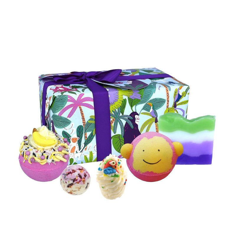 Unleash your fierce, untamed spirit & step into the wild side with our collection of handmade cosmetics that will ignite your senses and set your adventurous self free! With untamed scents and bold colors, it's time to release your inner roar, because with the "You're Wild" Gift Pack, you're ready to conquer the world! This Gift Pack Contains: Banana Delight Blaster - What a delight we have here! Uplift your spirits, a blend of may chang and marjoram essential oils. And a sweet banana fragrance blended with a touch of ripe strawberry. Purple Kiwi Soap - Float along the juicy waves of mouthwatering kiwi fruits! Layered with Petitgrain & Lime essential oils, this is a fruity favourite for your bathroom! Cheeky Monkey Bath Blaster - This little character really is a cheeky monkey…sprucing up your bath time with a punchy raspberry ripple fragrance enhanced with sweet orange and grapefruit essential oils to energise and uplift your mood. Bring out your cheeky side! Shake Your Tail Feather Mallow - Twist it! Shake it, shake it, shake it, shake it baby! We've got all in a flap and our pretty polly has got us grooving! With Grapefruit & Mandarin essential oils the parrot party never stops! Flower Power Creamer - Take a walk through the wild flower meadows and join the floral frenzy. With Rose and Geranium essential oils, this petal packed creamer will do nothing but pamper you!