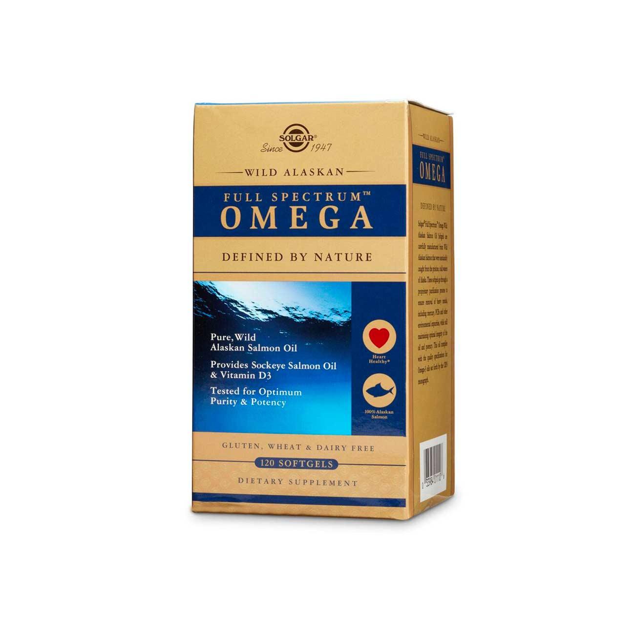 Solgar® Full Spectrum™ Omega Wild Alaskan Salmon Oil Softgels are carefully manufactured from Wild Alaskan Salmon that were sustainably caught from the pristine, cold waters of Alaska. These softgels go through a proprietary purification process to ensure removal of heavy metals, including mercury, PCBs and other environmental impurities, while still maintaining optimal integrity of the oil and potency. The levels of EPA, DHA, and other fatty acids found in Solgar's softgels – and the proportions of each in relation to one another – reflect those found in wild salmon.